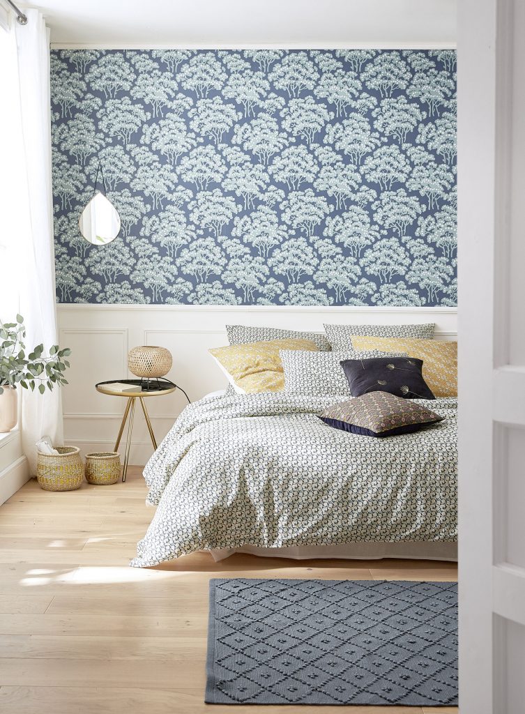 Rien n’interdit d’oser les contrastes forts : associer un papier peint à une couleur issue du même éditeur, par exemple, comme l’a fait Papermint X Mercadier. Avant de trancher, prendre le temps de tester les nuances pour trouver celle qui correspond à l’atmosphère recherchée. La chambre doit être un refuge, confortable et rassurant. Un bon réflexe consiste à tester une teinte sur un mur principal, puis à choisir des tons plus clairs pour le reste de la pièce.