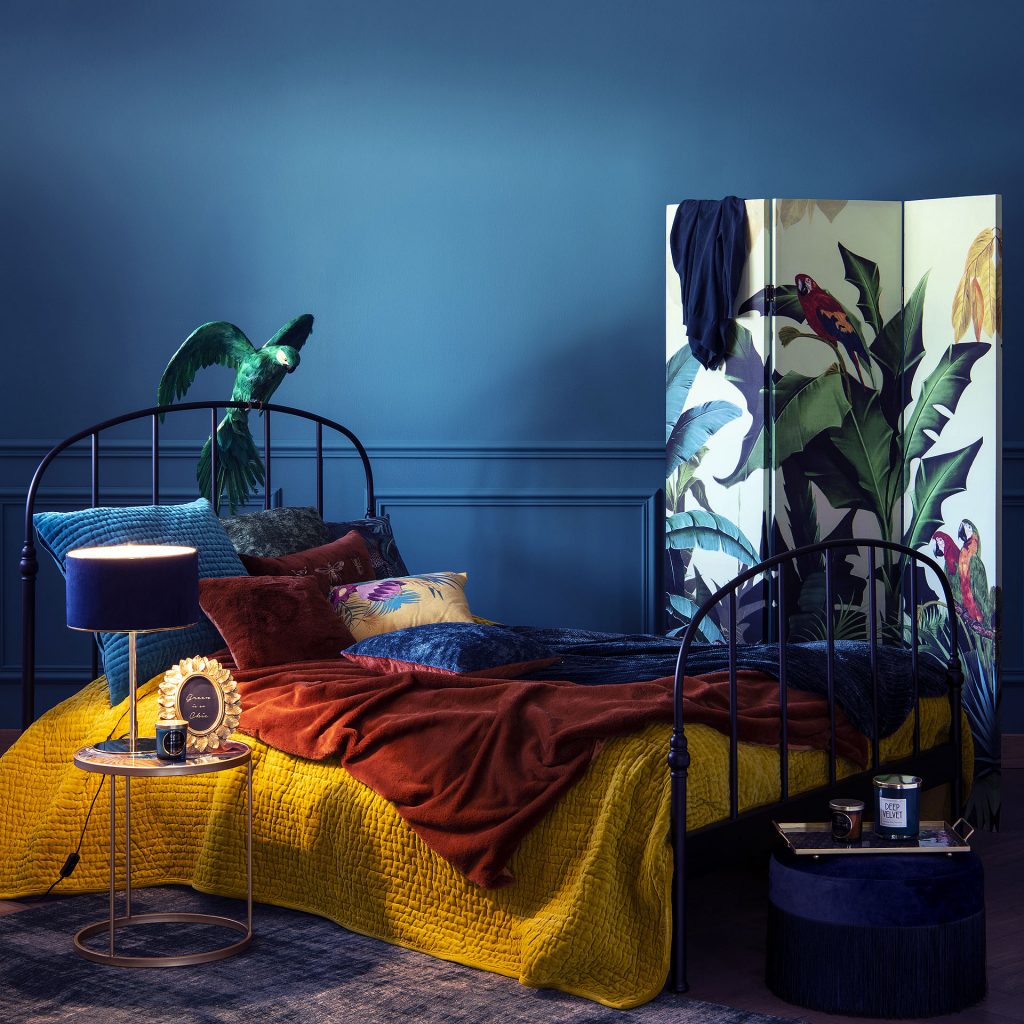 Envie d’oser des couleurs franches, comme un bleu paon ? Quelques accessoires décoratifs bien choisis suffisent à dynamiser l’ensemble, comme ici avec le thème Jungle proposé par Maisons du Monde. Pour la chambre d’enfant, peindre une chaise ou un bureau en couleur claire apporte une note ludique sans surcharger la pièce.